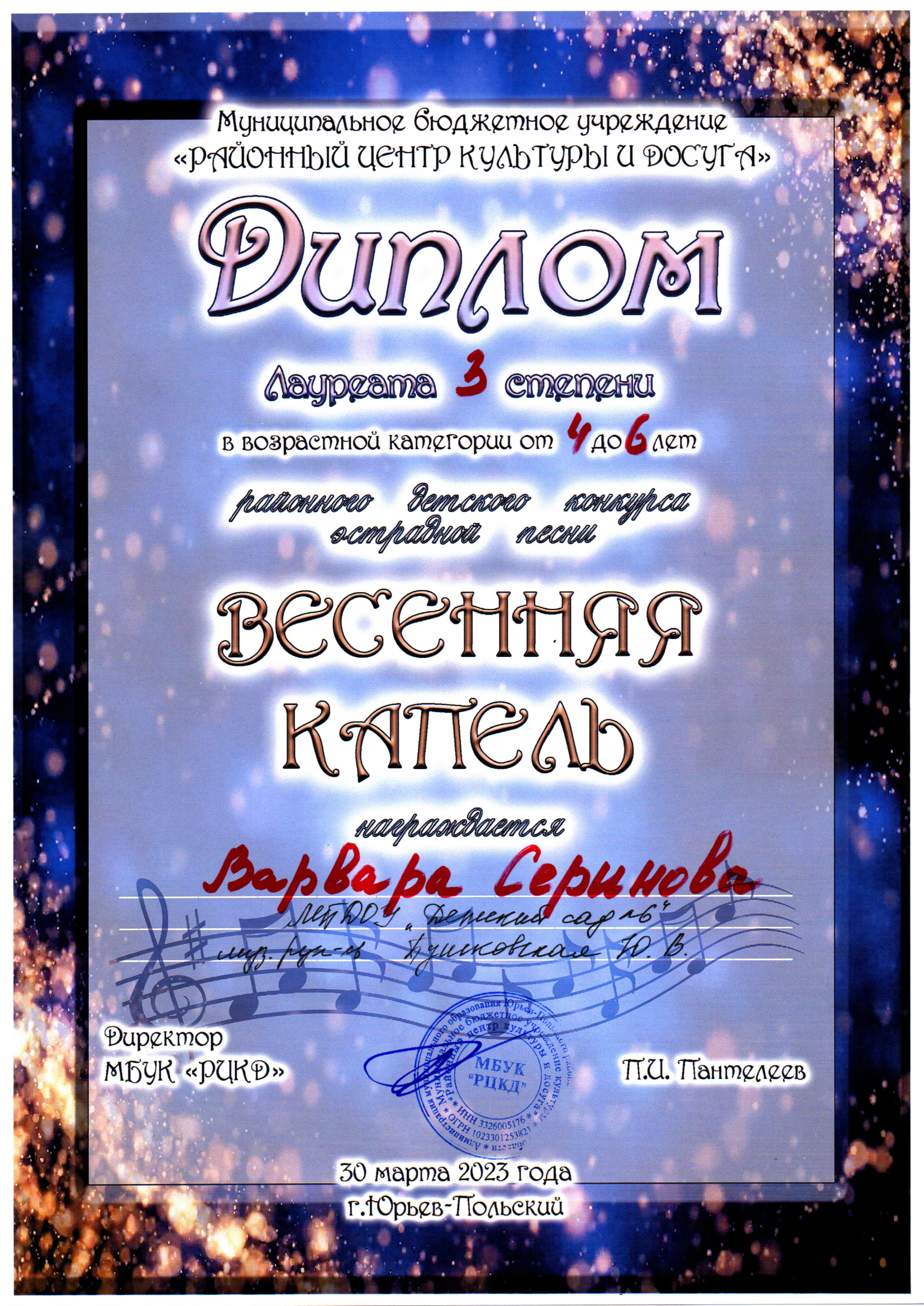 Серинова Варвара награждена именным Дипломом лауреата 3 степени в возрастной категории от 4 до 6 лет.