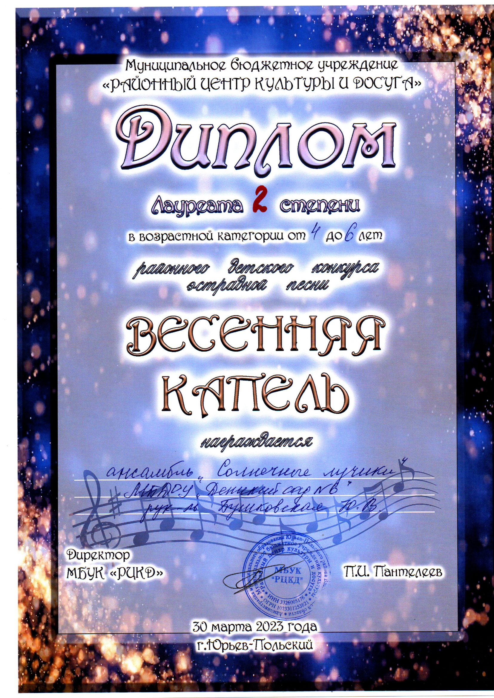 Наш ансамбль «Солнечные лучики» (музыкальный руководитель Бушковская Юлия Владимировна) награжден Дипломом Лауреата 2 степени в возрастной категории от 4 до 6 лет.