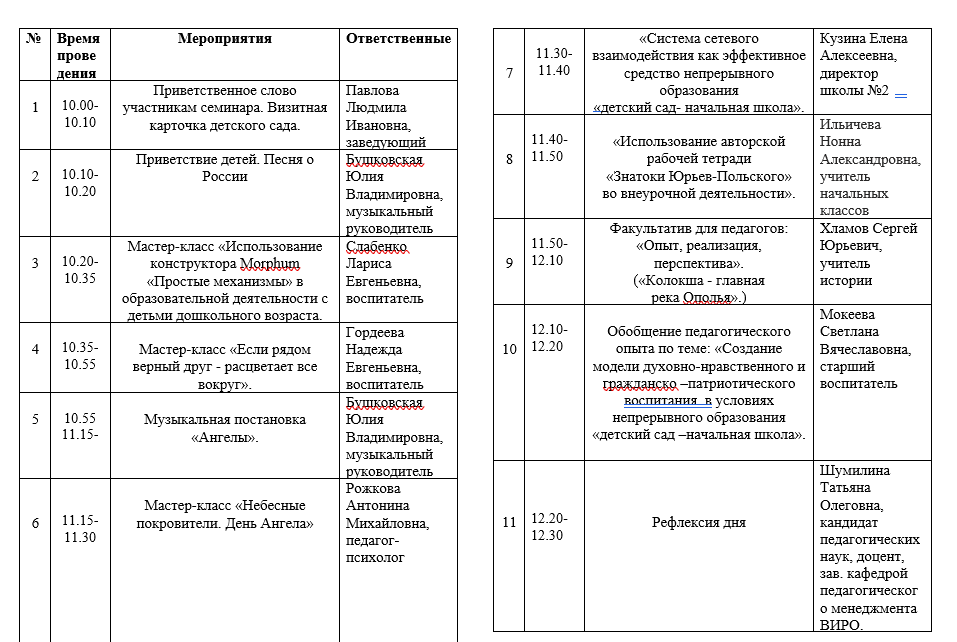 В рамках семинара были проведены мастер-классы «Использование конструктора Morphum «Простые механизмы» в образовательной деятельности с детьми дошкольного возраста" (воспитатель Слабенко Л. .), «Если рядом верный друг - расцветает все вокруг» (воспитатель Гордеева Н. Е.), «Небесные покровители. День Ангела» (педагог-психолог Рожкова А. М.), «Использование авторской рабочей тетради «Знатоки Юрьев-Польского» во внеурочной деятельности» (учитель начальных классов Ильичева Н. А.), факультатив для педагогов: «Опыт, реализация, перспектива» - «Колокша - главная река Ополья» (учитель истории Хламов С. Ю.).