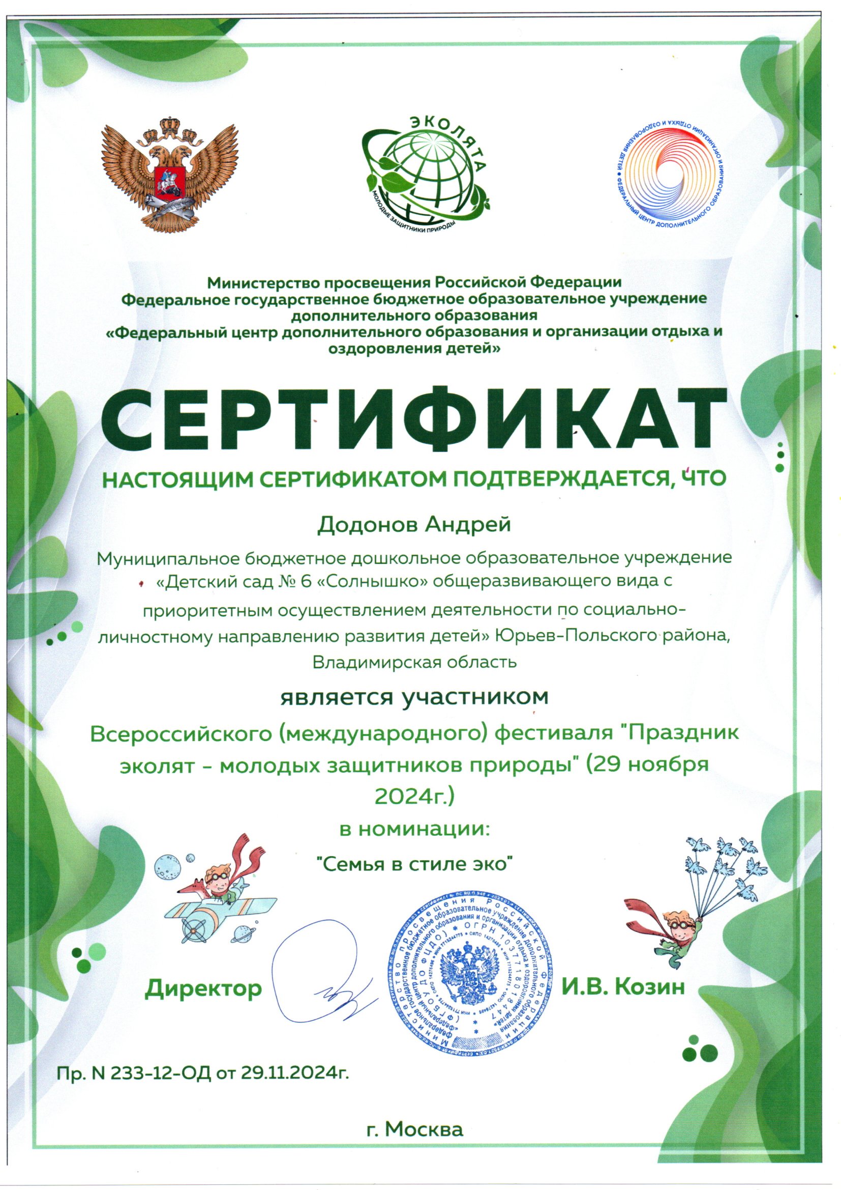 Семья Андрея Додонова, воспитанника подготовительной к школе группы МБДОУ детский сад №6 (воспитатель Гордеева Н.Е.) приняла участие в муниципальном этапе Всероссийского конкурса «Праздник эколят- молодых защитников природы», проходившем в период с 16.09.2024г. по 01.10.2024г. и стала победителем в номинации « Семья в стиле Эко». Был представлен видеоролик «Зелёная сказка семьи», который в дальнейшем стал победителем регионального этапа, а Додонов Андрей явился участником Всероссийского( международного) фестиваля.