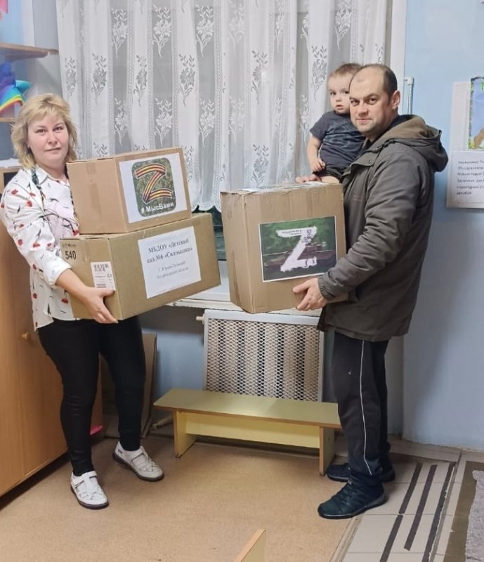 Родитель детского сада, Каргапольцев Михаил Михайлович, занимающийся организацией волонтёрской помощи участникам СВО, доставит гуманитарную помощь от детского сада на передовую с пожеланиями Победы и скорейшего возвращения домой.