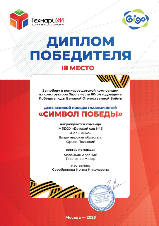 Поздравляем Победителей - III место ( воспитанники старшей группы Арсений М., Макар Т., наставник воспитатель Серебрякова Ирина Николаевна) в Конкурсе детской композиции из конструктора Gigo в честь 80-ой годовщины Победы в годы Великой Отечественной Войны "День Великой Победы глазами детей "Символ Победы"
