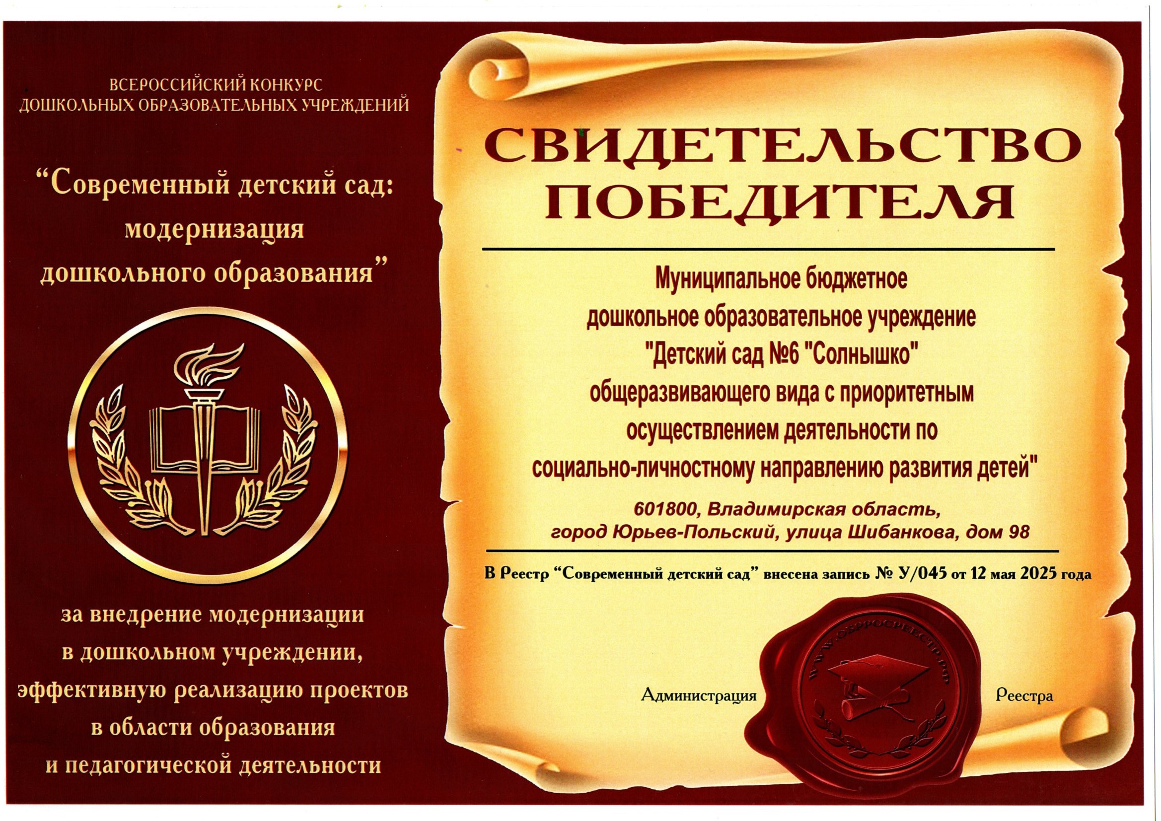 МБДОУ «Детский сад №6 «Солнышко» стал победителем Всероссийского конкурса дошкольных образовательных учреждений «Современный детский сад: модернизация дошкольного образования», за внедрение модернизации в дошкольном учреждении, эффективную реализацию проектов в области образования и педагогической деятельности.